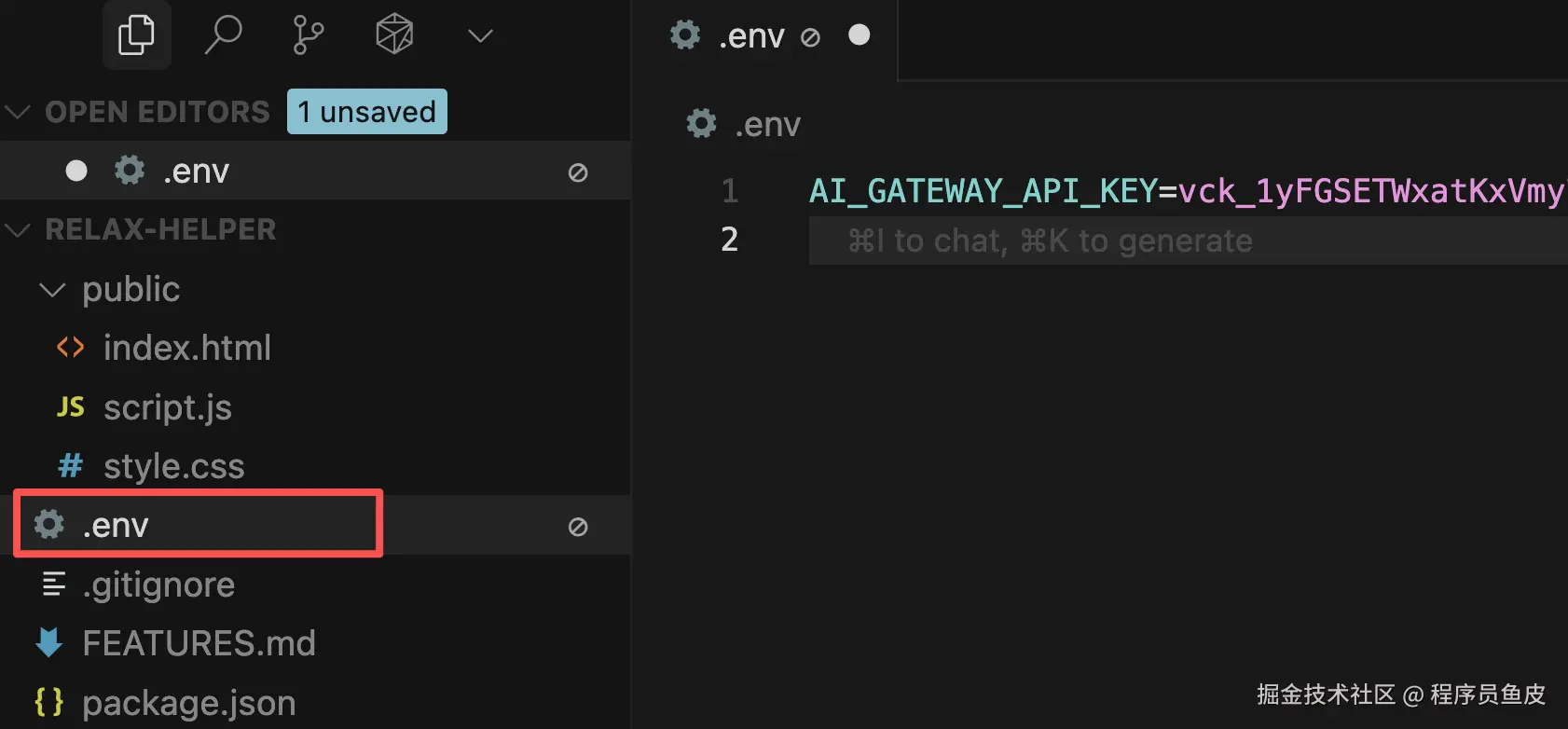 然后在根目录下创建 .env 环境变量配置文件,填入 AI Gateway 的 API Key: