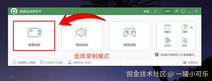 第1步:首先启动数据 蛙录屏软件,等待程序初始化完成后进入主界面。界面中会清晰展示 “屏幕录制”“游戏录制” 等核心模式,考虑到日常录屏(如课件、软件操作)的通用性,此处以 “屏幕录制” 模式为例展开讲解,点击对应模式即可进入设置界面。