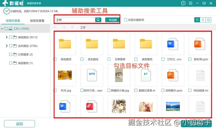 步骤2: 等到软件页面的左上角显示【扫描完成】后,我们才能进行恢复文件的选择;选择的时候,可以使用【搜索框】【筛选器】等其他搜索辅助工具帮助我们更快找到目标文件;