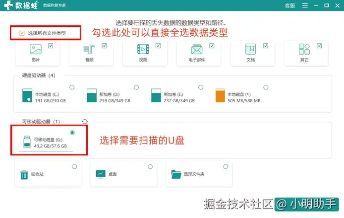 步骤1: 打开软件进入首页,在软件首页的不同栏目中选择数据类型和扫描U盘,选择完之后再点击【扫描】的按钮;