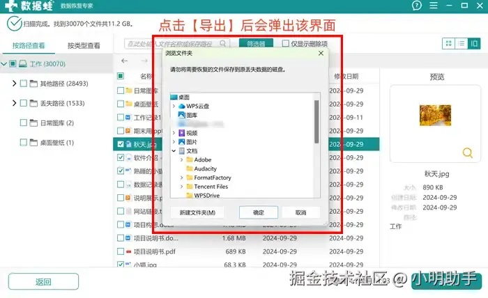 步骤3: 选择到目标文件后点击【导出】,之后我们还需要在【浏览文件夹】中选择文件恢复后存放的位置。