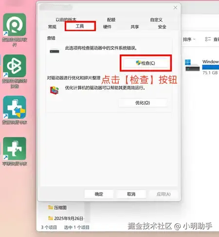 步骤2: 在【属性】页面上点击【工具】,然后按下【检查】按钮。