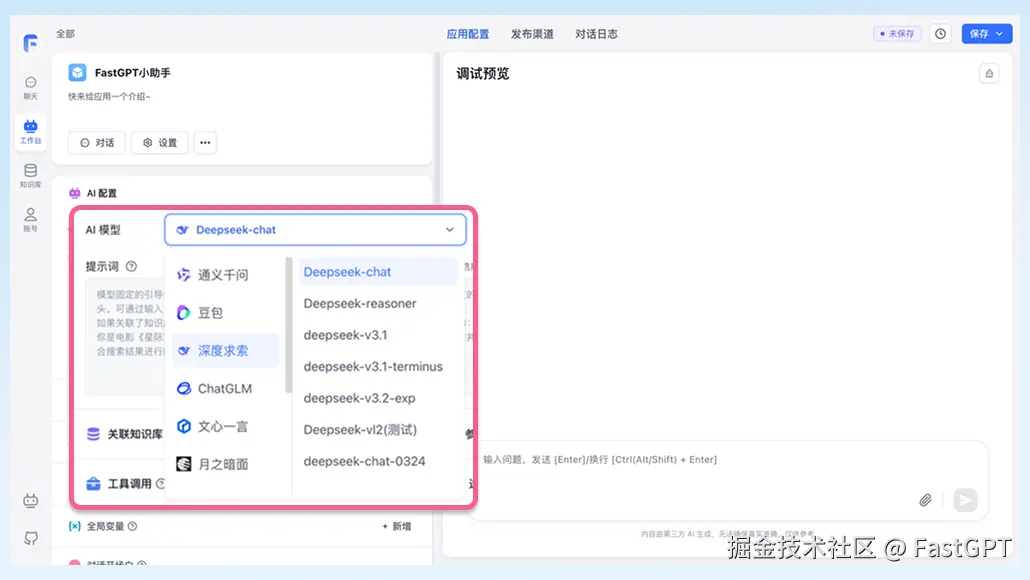 在 FastGPT,用户无需自行申请和配置繁琐的 API Key,可以直接在列表中选择心仪的模型并立即使用。 模型的调用会通过 FastGPT 积分统一计费,极大地简化了接入流程。