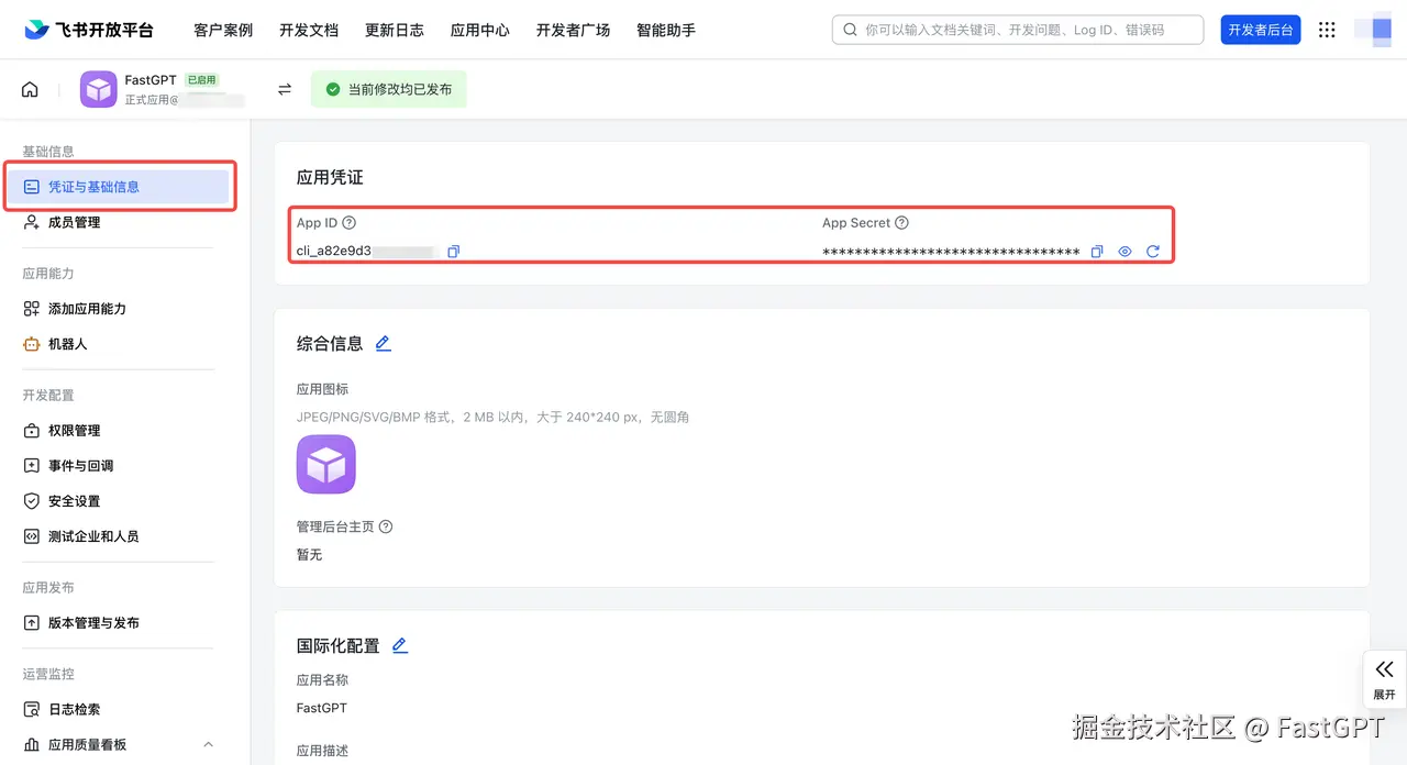 连接 FastGPT 与飞书在 FastGPT 应用「发布渠道」→「飞书机器人」中新建链接,填入凭证。