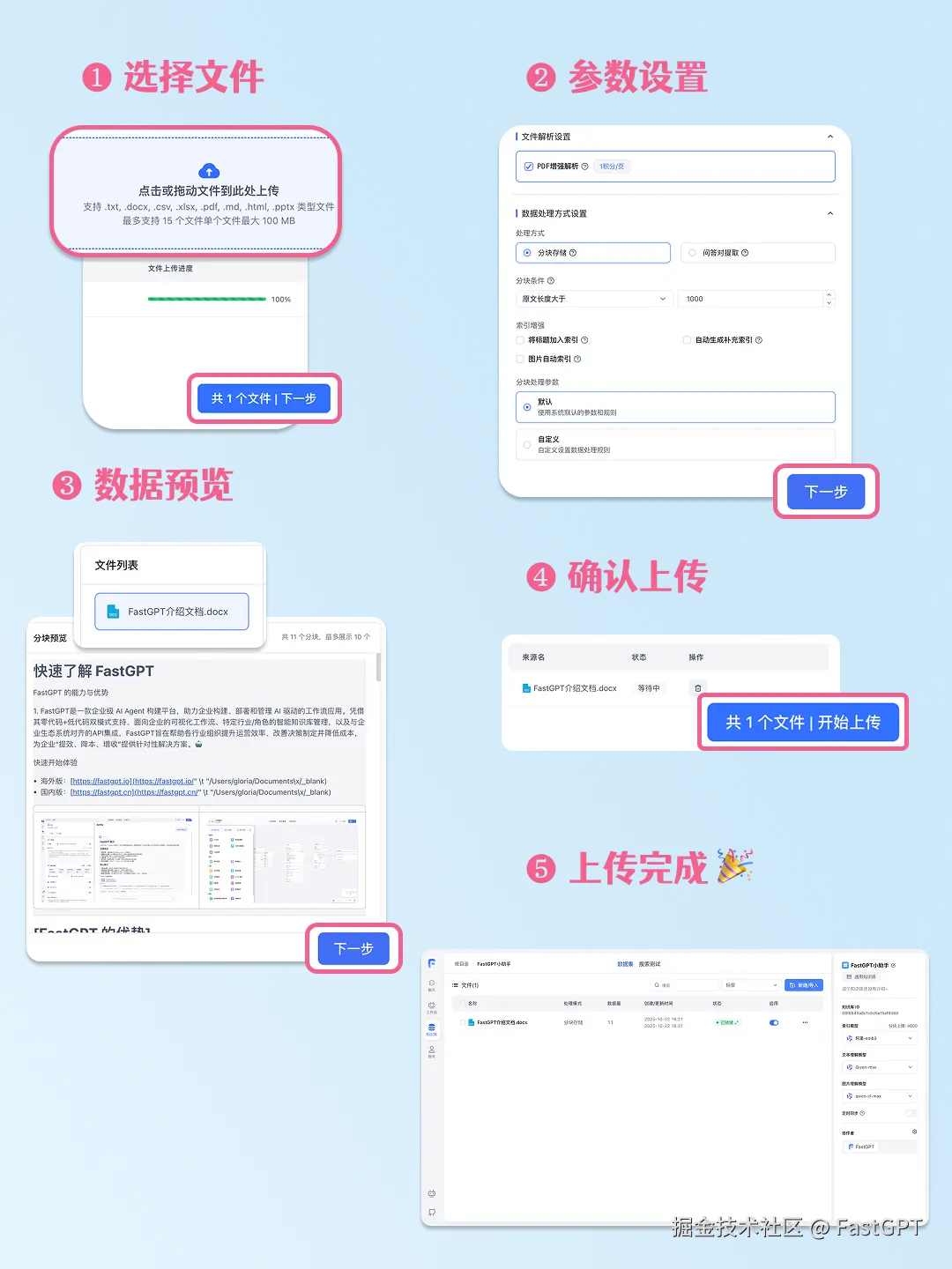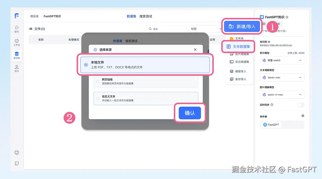 按照页面引导完成文件上传。FastGPT 会将非结构化的文本数据,转化为 AI 能够理解和高效检索的“向量”数据。