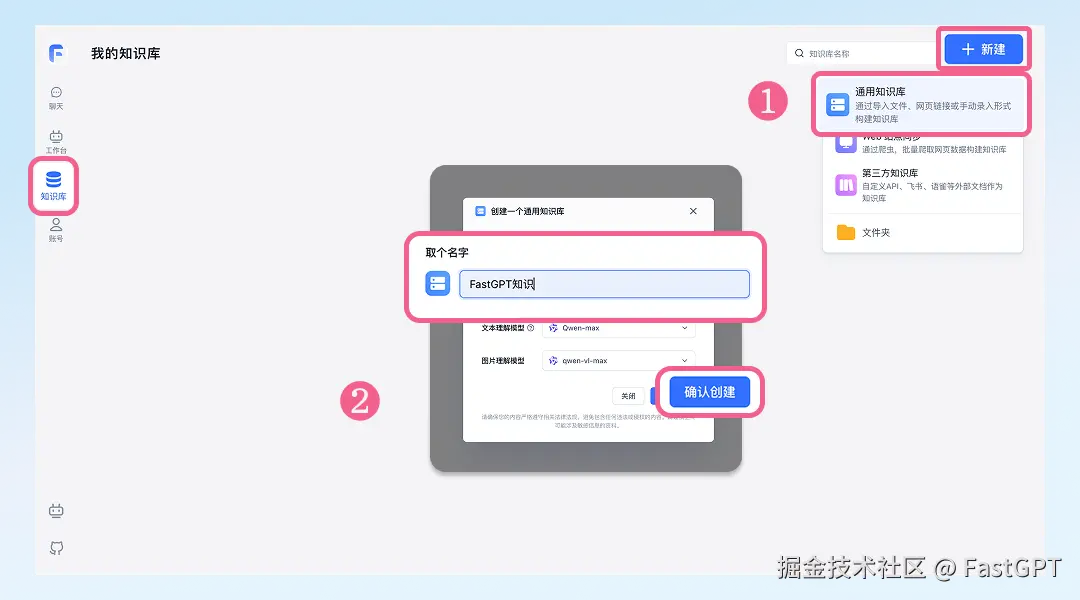 登录 FastGPT 平台 ai.fastgpt.cn/15,进入「知识库」-「新建」-「通用知识库」,输入名称并创建。