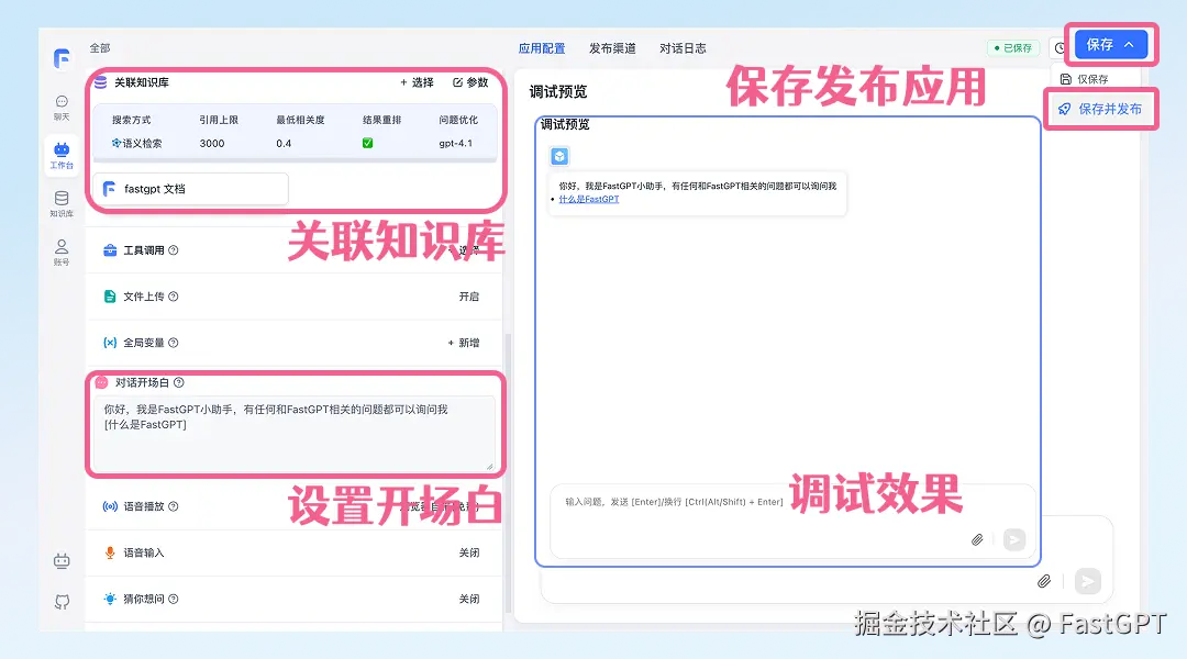 关联已建知识库,设置开场白,在「测试预览」调试后,点击「保存并发布」即完成搭建。