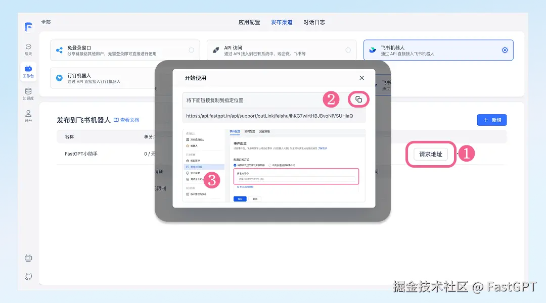 - 复制 FastGPT 生成的「请求地址」填入飞书后台。返回飞书提交审核并发布。