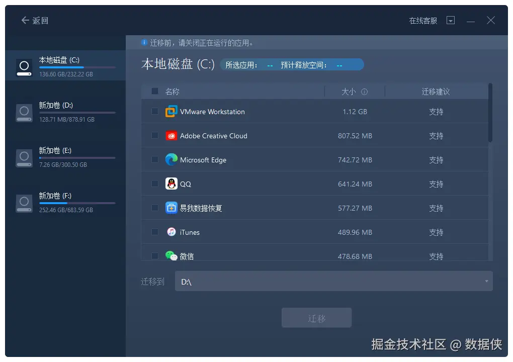 步骤3:选择需要迁移的应用程序,并选择迁移到的目标路径,点击“迁移”。