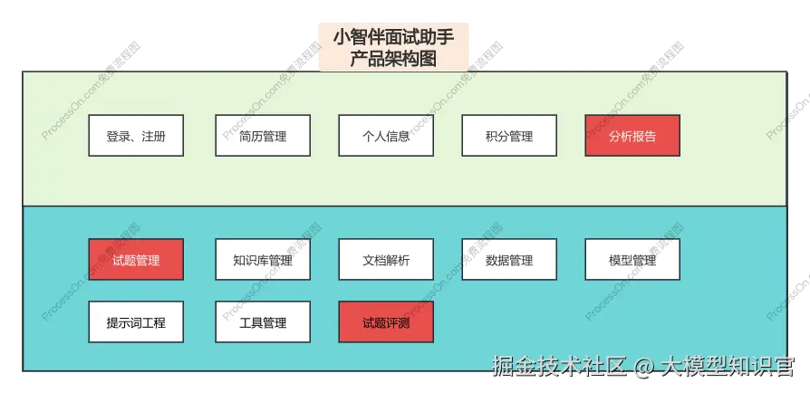 针对小智伴这个项目,我们需要先梳理清楚那些业务场景,是需要用到大模型的。下面我们通过产品架构图来梳理一下。