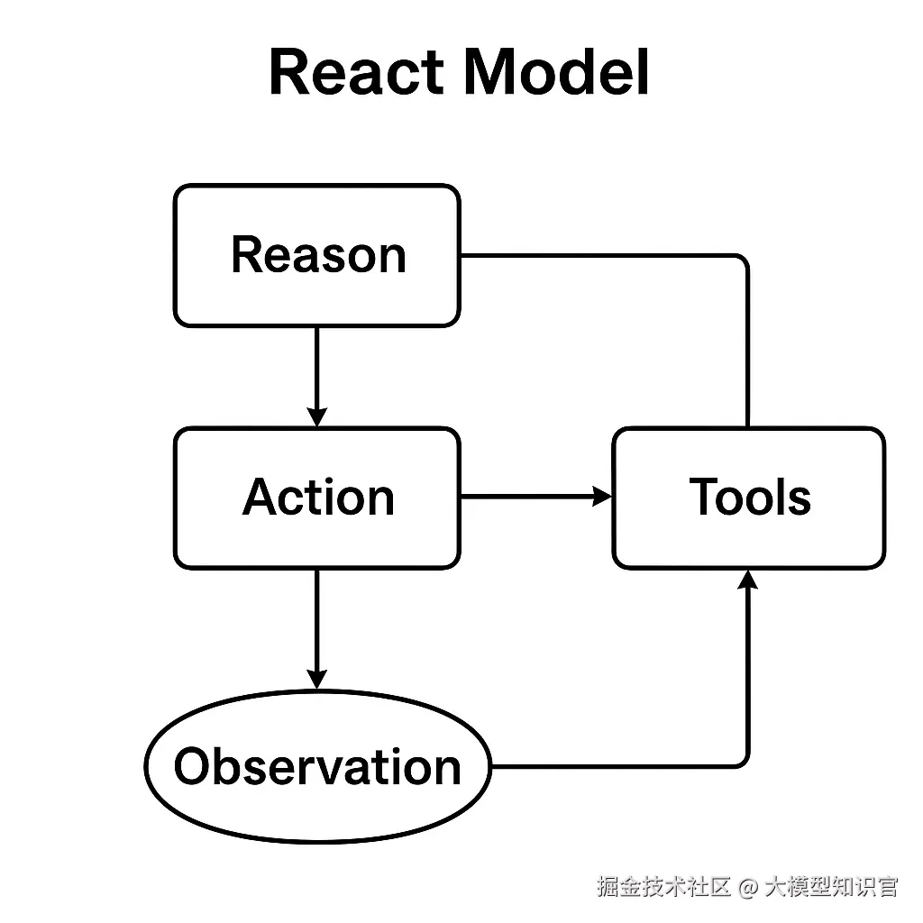 概念:模型在“推理(reason)”与“动作(action)”之间循环:先推理决定要做什么,然后直接调用工具(检索、计算器、API),再基于工具结果继续推理,形成交错的推理—执行链。