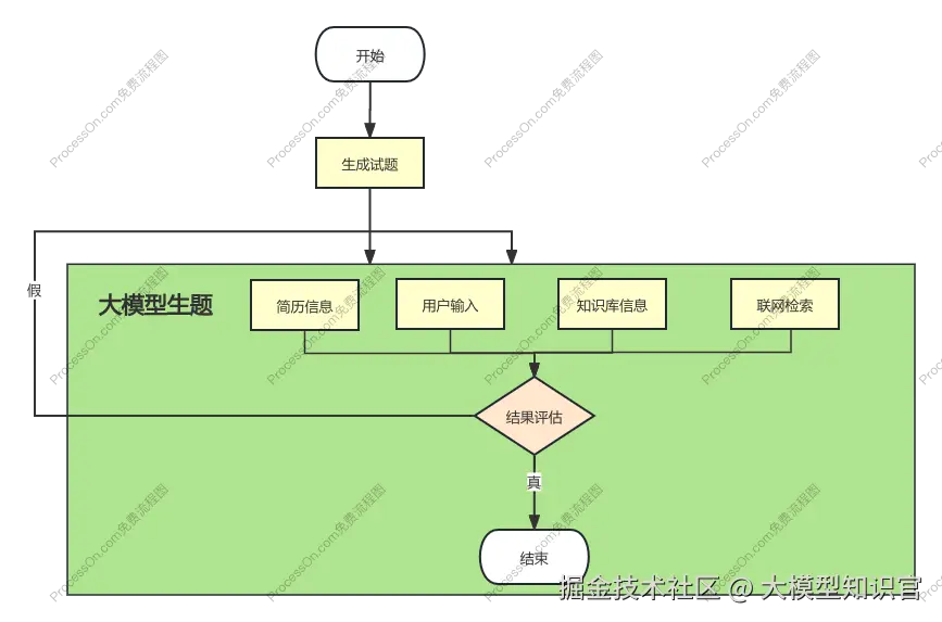 需求确定以后,我们需要把需求再次转化为流程图,从流程图里面,我们能知道我们需要抽象出来那部分是推理逻辑,那部分我们需要设置工具供推理逻辑调用。接下来,我们针对试题生成画流程图,逐一进行分析。