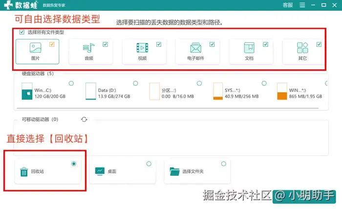 步骤1: 打开软件就能开始选择【回收站】,选择需要恢复的文件类型,点击【扫描】进行误删清空回收站文件恢复;