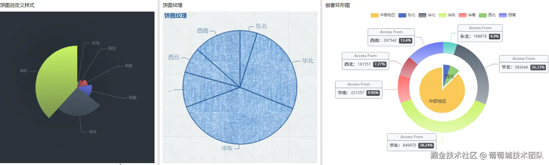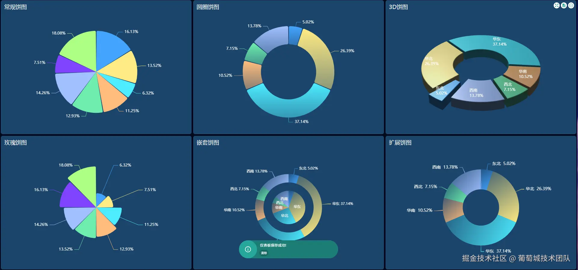 **(1)特点:**占比类图表显示同一维度上的占比关系。饼图通过将一个圆饼按照分类的占比划分成多个区块,整个圆饼代表数据的总量。