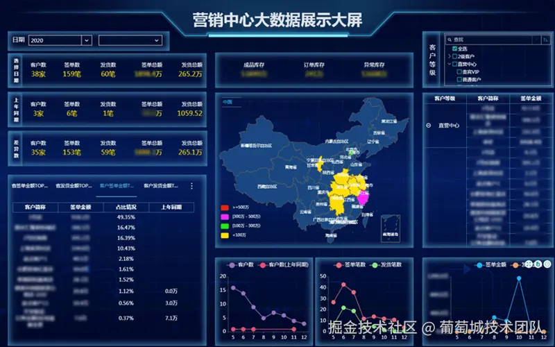 制作多维度数据分析大屏,用于查看各省、市、区县的年度、月度等维度的签单金额、发货金额、客户数量、签单笔数、发货笔数等,以及能查看上年同期的比较数据,以达到决策分析,跟踪和掌握总体业务。