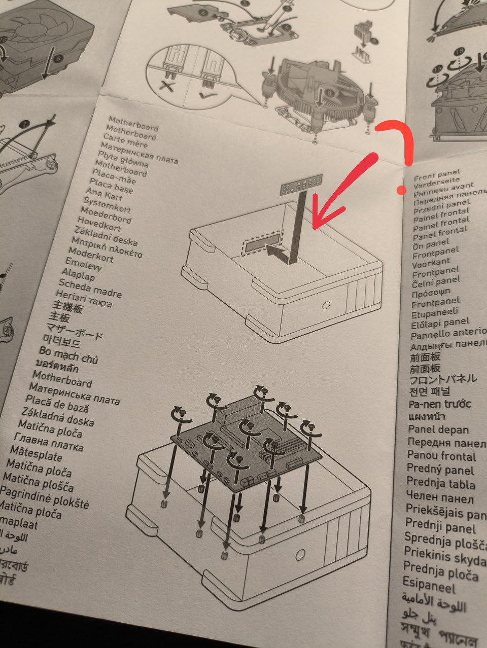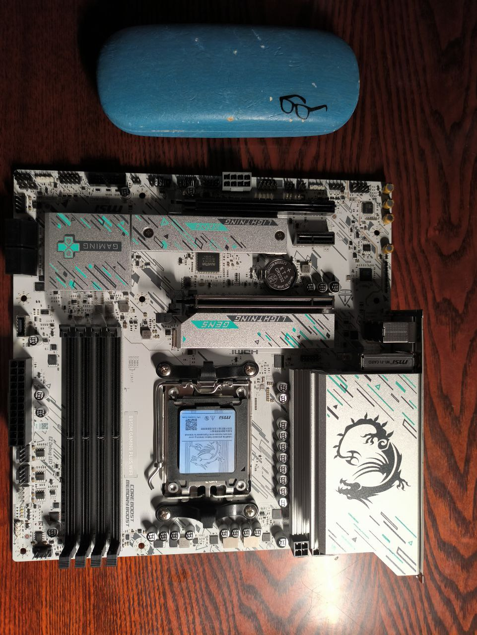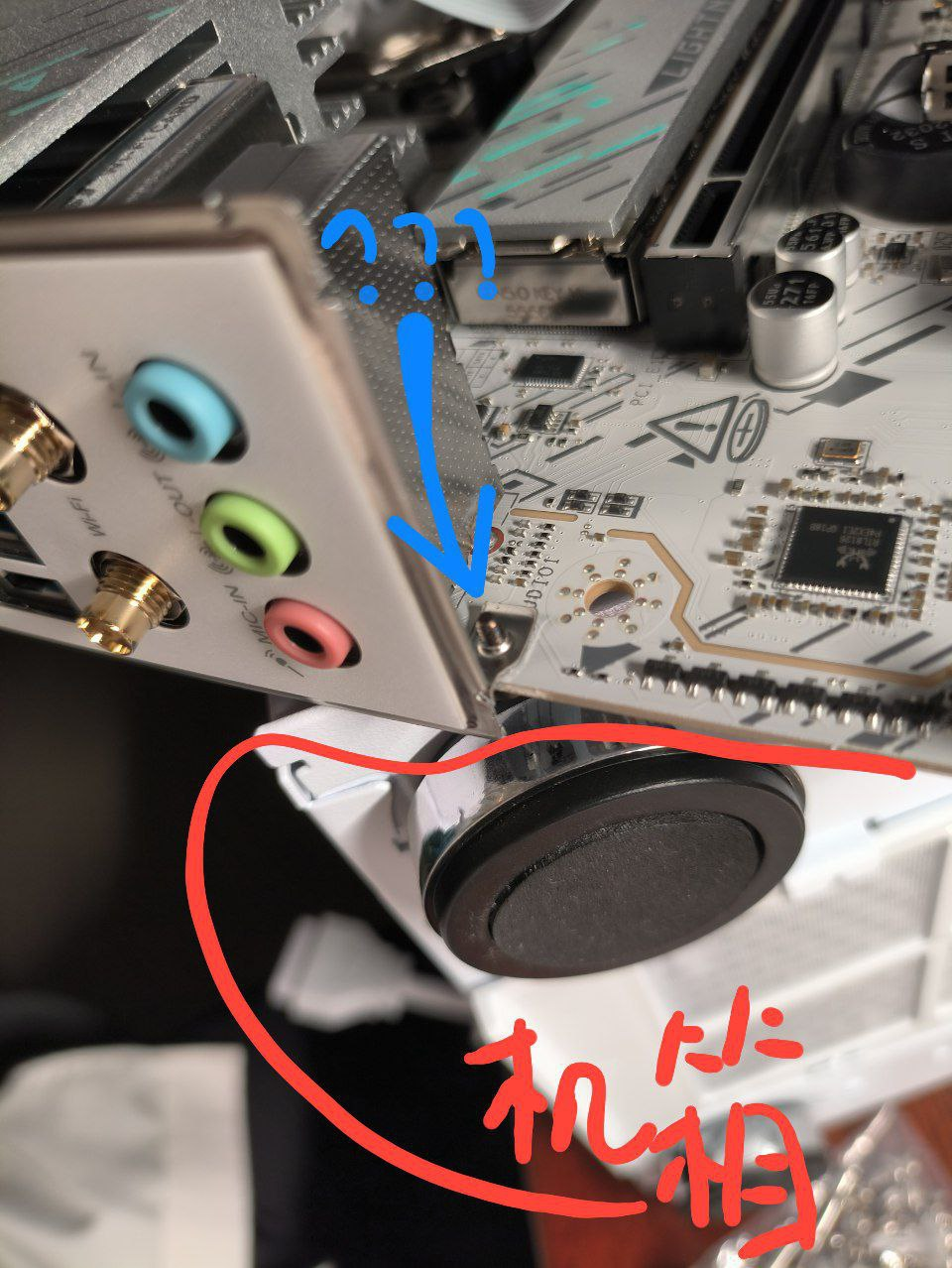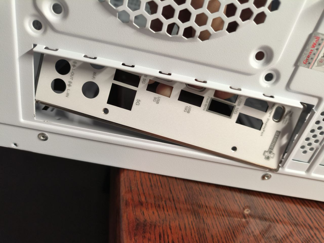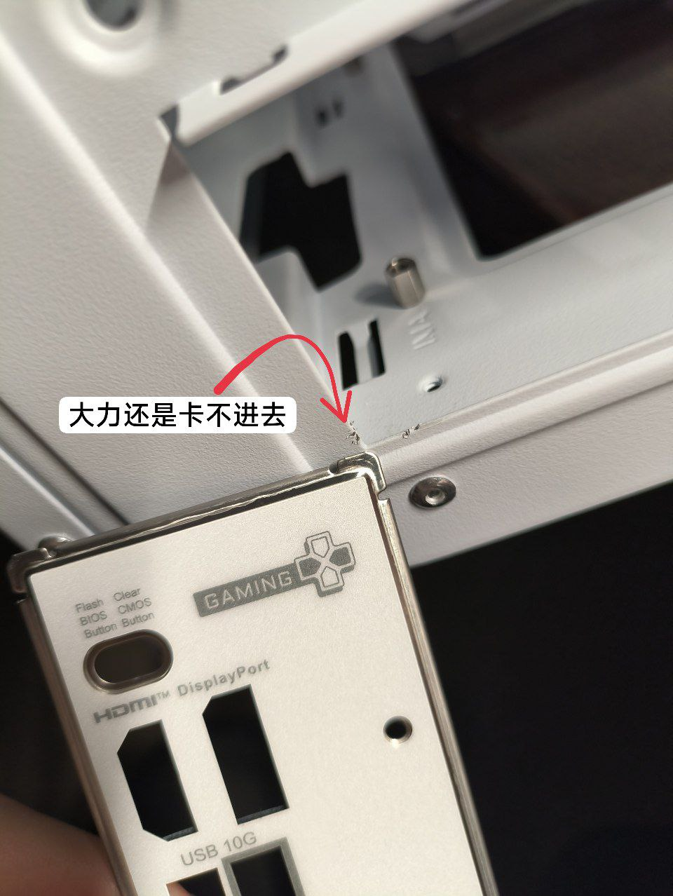 IO 挡板。说起来就想骂微星,主板说明书图示要把挡板拆下来,先上到机箱上。结果拆了发现卡不上机箱,然后又看了一下主板和 IO 挡板的结构,发现挡板是上在主板上,并且用四颗螺丝固定好的,把主板上到机箱里去的话,挡板绝对上不进去。于是我就在说明书,主板客观情况,网上教程三个之间反复横跳怀疑人生。挡板被我卸下装上反反复复至少三次。最后在极度怀疑人生的情况下,把主板上到了机箱。也不管挡板在机箱后方摇动,用了一点力让偏移的机箱螺丝孔对齐主板,强行上了主板螺丝上去。结果主板上完了,IO 挡板也不动了……