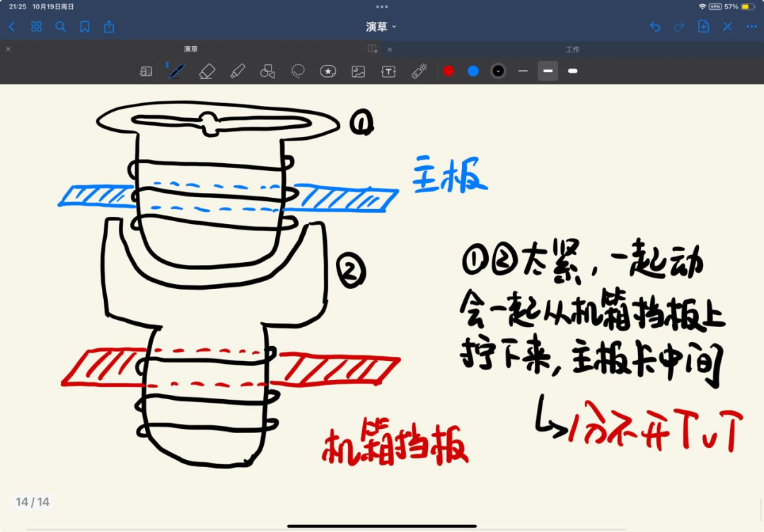 上主板螺丝。有一颗螺丝拿成电源螺丝了,看快了没看出来,就往主板上。结果上到一半发现拧不进去,完蛋。好死不死的,这俩螺丝尺寸差不多,我还取不出来。每次一动就连着螺母一起动,然后就把机箱上的螺母连带着卸下来,就是把螺丝和螺母分不开,还把主板夹在中间。
