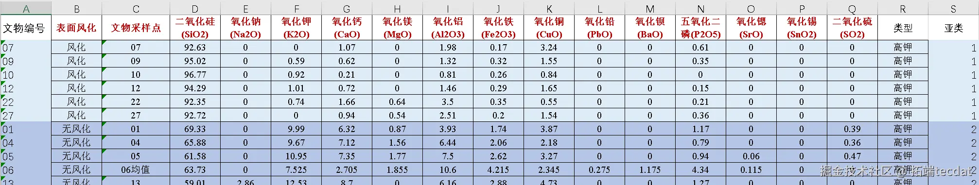 - 聚类分析中暂不考虑风化时间长短对成分的影响;