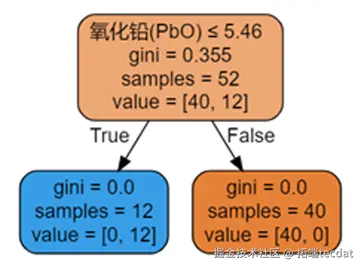 核心结论:氧化铅(PbO)是最关键的分类指标——当PbO含量<5.46时,判定为高钾玻璃;当PbO含量≥5.46时,判定为铅钡玻璃,模型训练集与测试集准确率均为100%。