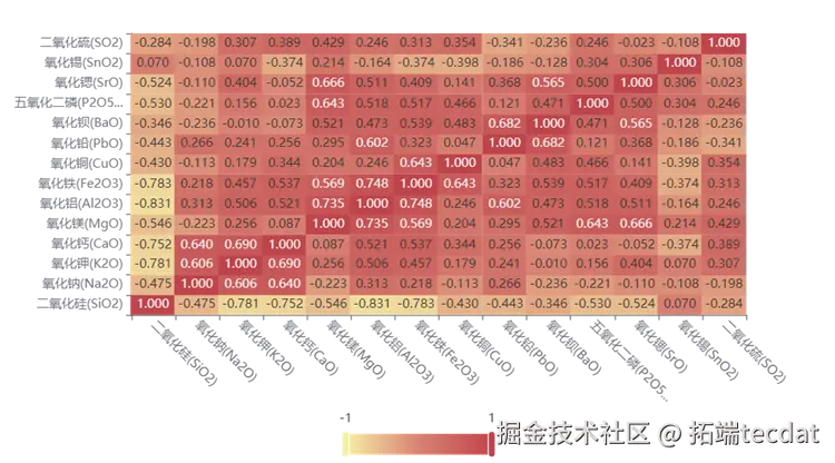 下图为铅钡玻璃成分相关性热力图,可观察到MgO与Al₂O₃(0.67)、PbO与BaO(0.65)呈强正相关: