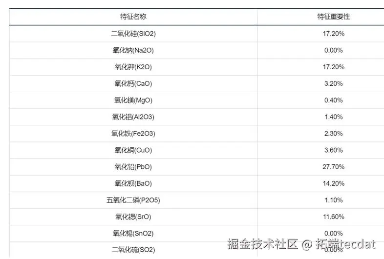 下图为各化学成分的特征重要性排序,PbO、BaO、SiO₂为Top3重要特征,与问题2的决策树结论一致: