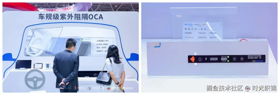 汽车智能调光玻璃创新技术展示区,集中展示汽车调光玻璃原料体系、技术方向和核心制造最新设备与尖端工艺,体现了智能汽车座舱向更智能化、沉浸化、更安全的发展趋势;