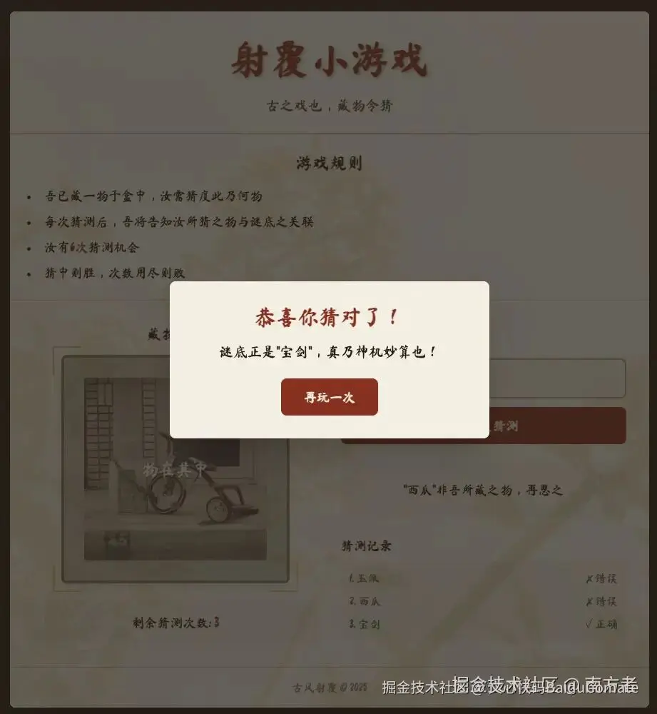 游戏开始了,此时,我猜测的是玉佩!(右下角也能看到猜测记录,但并没有对)