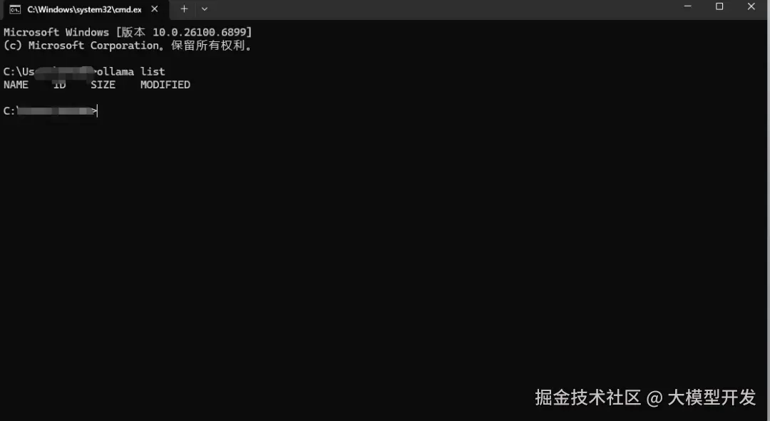 重新打开CMD命令窗口,输入ollama list,出现以下界面。(新版ollama安装完成后会直接弹出对话窗口)
