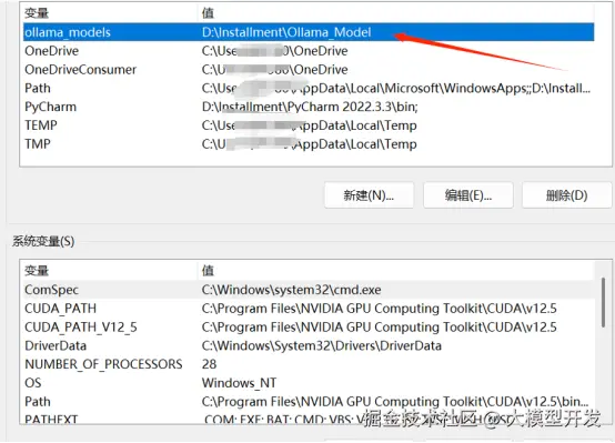 (3)在 “用户变量” 下,点击 “新建”,输入变量名 “ollama_models”,变量值为你想要存储模型的目录路径,如 “D:\ollama_models”,点击 “确定” 保存更改。