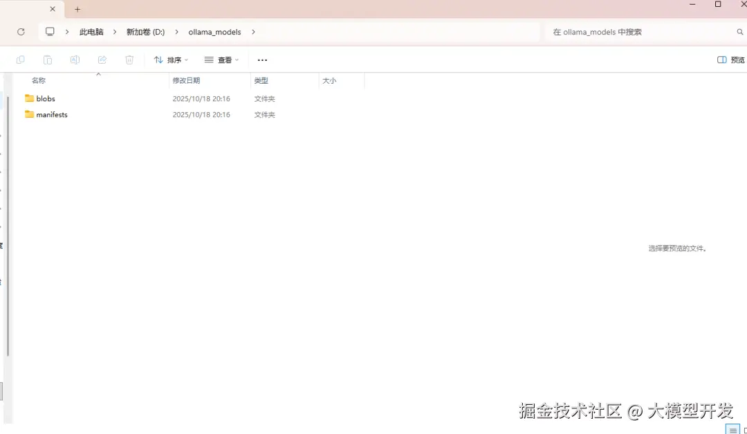 (4)若 Ollama 已经在运行,需先关闭托盘应用程序,然后从开始菜单重新启动,或在保存环境变量后启动新的终端。在模型存放目录会生成下面两个新的文件夹,此时目录更改成功。