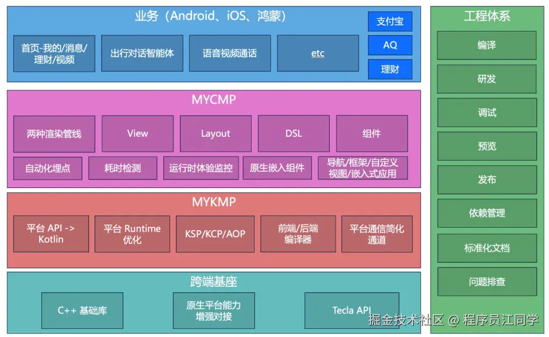 - MYKMP研发背景与目标:随着鸿蒙系统诞生,移动端从双端变为三端,高效迭代并保持业务一致性成为挑战。C++ 存在局限,而Kotlin具有开发者易上手等优势,因此支付宝决定自研MYKMP框架,为三端业务提供统一研发体系,在保证接近或超越原生体验的同时,显著降低整体研发成本 。