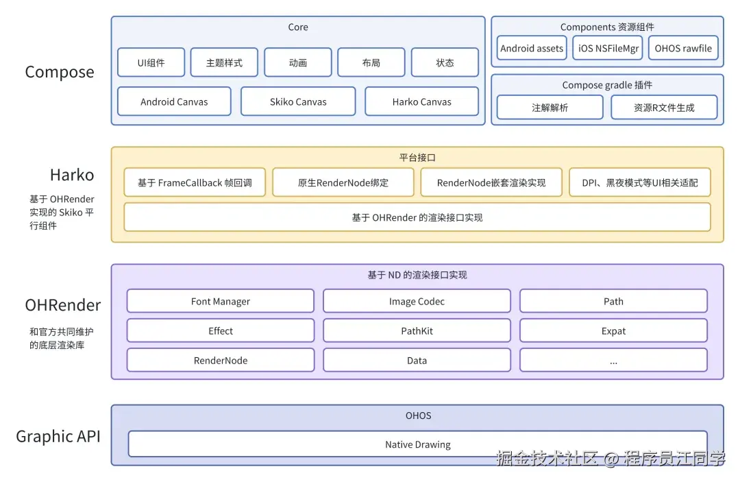 - 整体架构设计:Compose处于最外层,为上层提供UI组件及相关API,管理布局树与更新状态,并封装UI渲染实现。Harko作为OHRender的Kotlin封装库,利用cinterop机制将OHRender的C++ API封装为Kotlin API,同时实现RenderNode和帧回调绑定。OHRender作为图形渲染库,复用Skia头文件与接口设计,通过封装Native Drawing图形接口提供渲染能力。这种架构使得各部分分工明确,协同实现渲染功能。