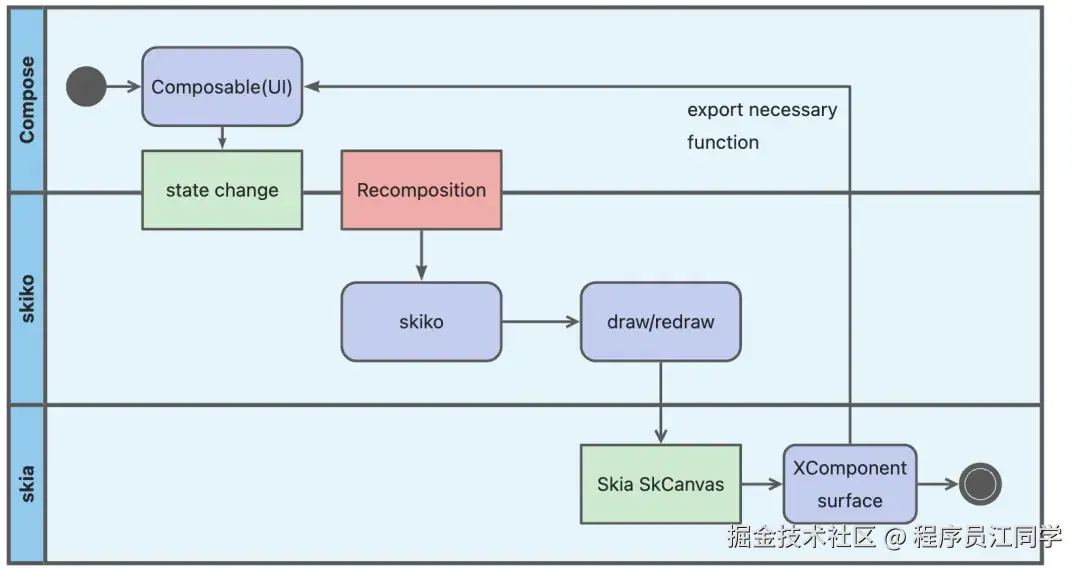 - 鸿蒙版本架构与实现:新增nativeTarget->ohosMain对接目标,自底向上逐层适配鸿蒙系统。设计了三层接入结构及脚手架,降低接入成本。在渲染上屏方面,依托系统XComponent组件对接Skiko完成绘制,并通过监听vsync信号逐帧渲染。跨语言交互上,构建Kotlin与ArkTS互调通道,降低业务使用成本。
