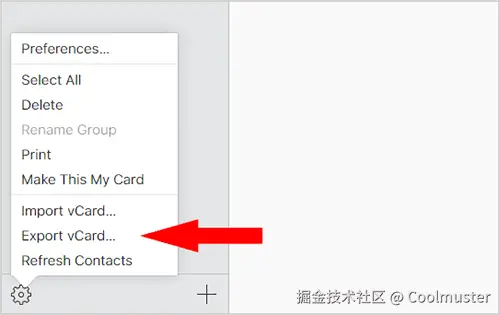 步骤 3. 选择要导出的联系人,然后单击“齿轮”图标 > 选择“导出 vCard”,将 iPhone 联系人导出到 PC。