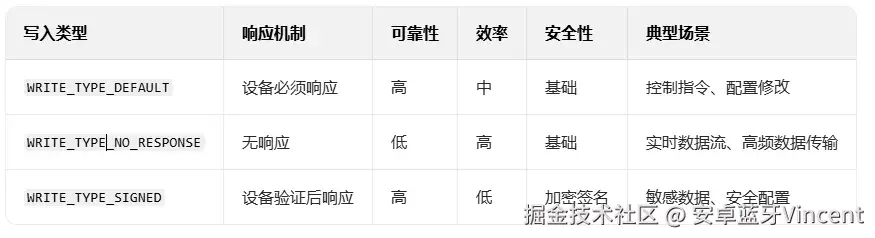 - WRITE_TYPE_NO_RESPONSE:高效无响应,适配高频传输