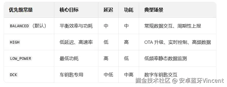 连接成功后调用 gatt.requestConnectionPriority(BluetoothGatt.CONNECTION_PRIORITY_HIGH);