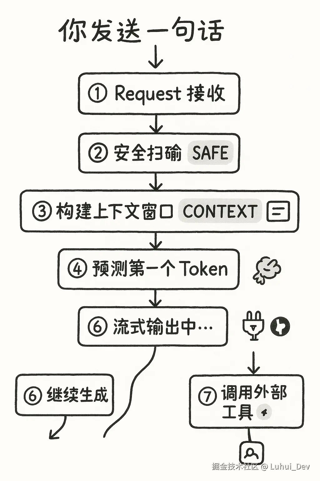 ① 接收到请求 → ② 安全扫描 → ③ 构建上下文窗口 → ④ 文本切割成 Token → ⑤ 开始预测第一个 Token ⑥ 一边预测一边实时往回流(你看到的“正在输入…”)→ ⑦ (如需要)中途调用某个外部工具 → 再继续生成