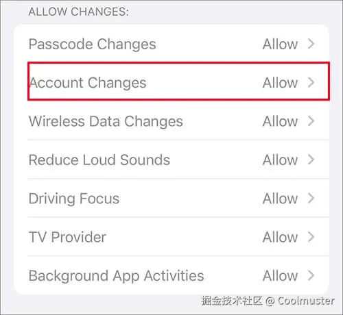 第四步:点击“账户更改”,并将其设置为“允许”。系统可能会提示您输入屏幕使用时间密码。