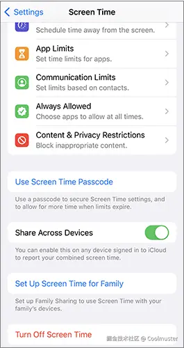 如果您已在设备上启用“屏幕使用时间”,则可能会限制您对 Apple ID 设置的访问。要检查并禁用它: