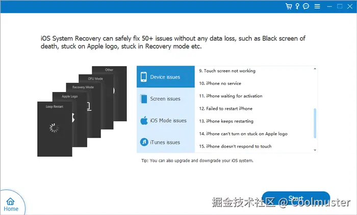 02将 iPhone 连接到电脑并信任连接。然后,点击“开始”,并按照屏幕上的说明将设备置于恢复模式。