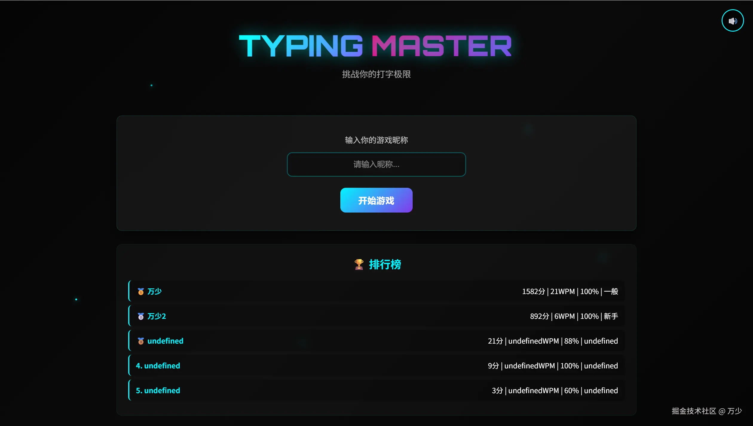 我想要生成一个 pc端的web的打字游戏网站 - 使用html+css+js来实现 - 功能包括有,输入玩家姓名、记录分数 - 游戏界面要求炫酷,可玩性高