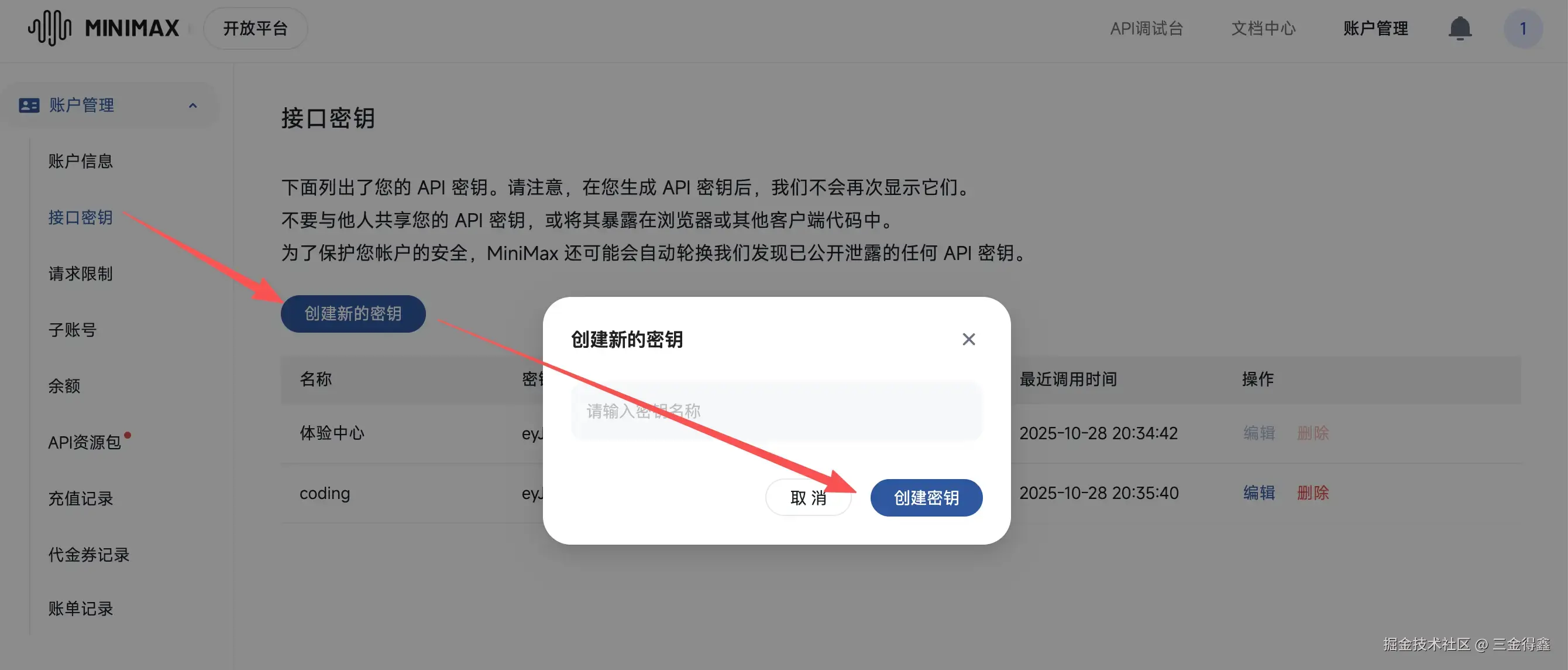 然后在新打开的 tab 页面中点击“创建新的密钥”按钮,随便输入一个名称然后点击创建密钥即可生成一个 API Key。