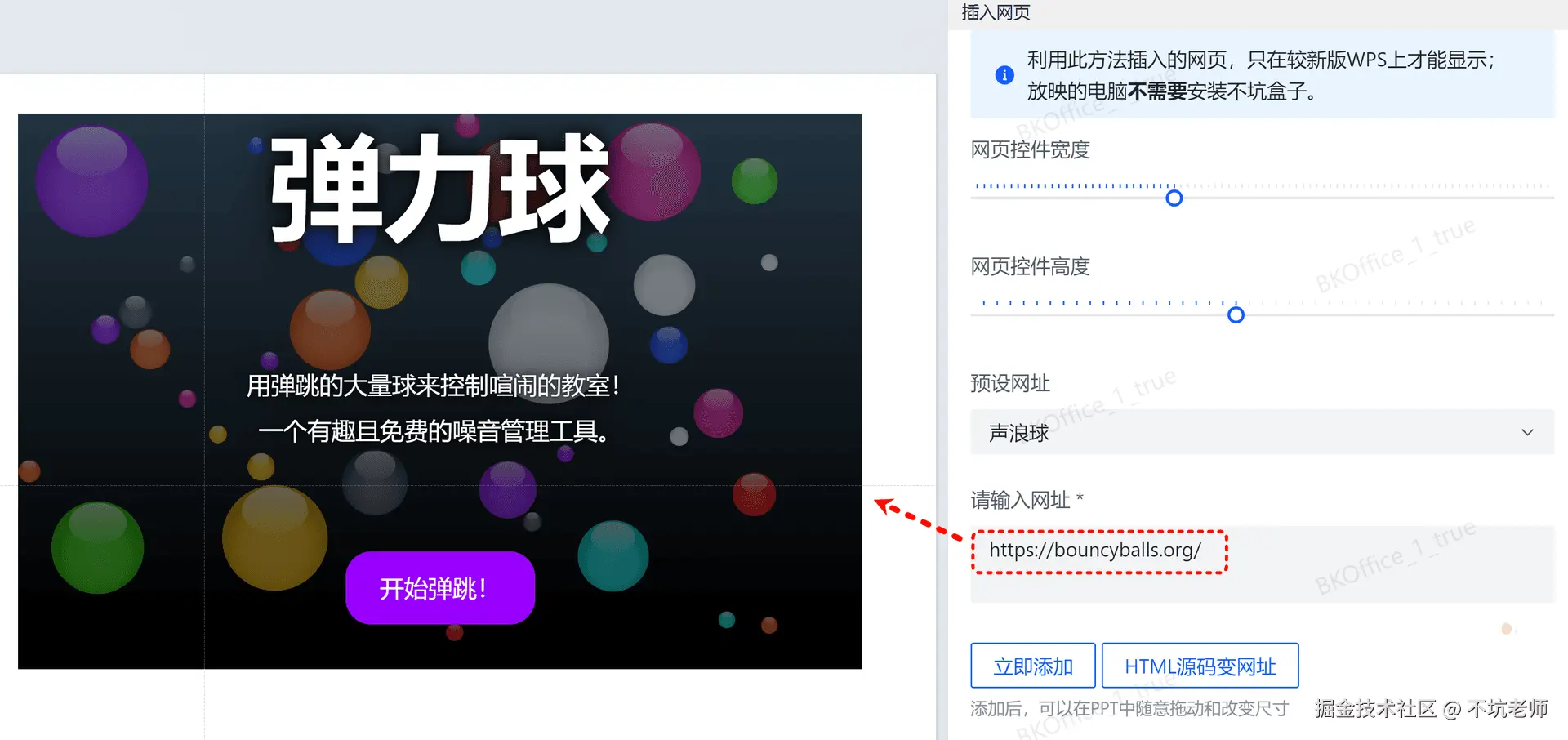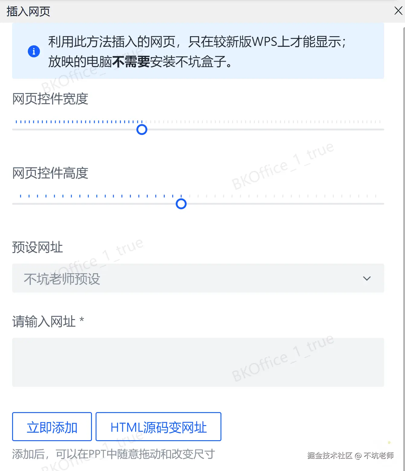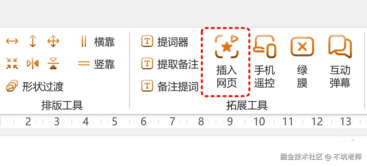 这个“插入网页”可和上面的不一样,因为用它插入到WPS中的网页,在放映的时候哪怕那台电脑上没有安装不坑盒子,也能正常显示网页。(放映时也得用WPS)