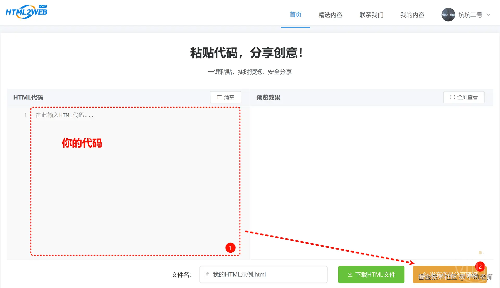 将弹出Html2Web的界面,把你的代码粘贴进去,生成一个网址:
