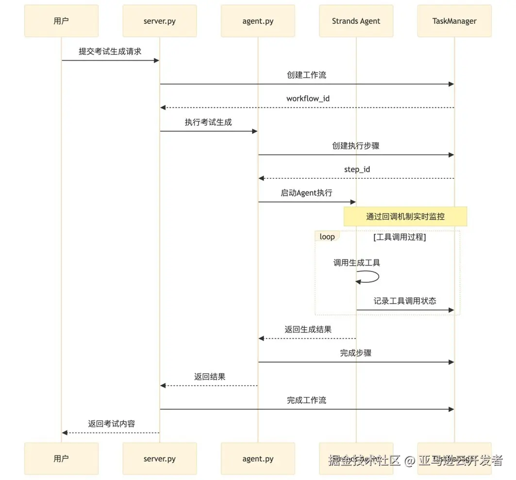 在教育领域,考试(一年级-高三年级,数学/科学/英语/历史等多学科)作为评估学生学习成果的核心手段,其传统生成方式长期存在诸多痛点:时间成本高昂、质量稳定性不足、题型覆盖局限、迭代效率低下等问题。为解决这些问题,我们开发了基于 Strands Agent 框架的 AI 考试生成项目。该项目依托大语言模型的强大能力实现考试内容自动化生成,核心目标包括将原本小时级的工作量压缩至分钟级、确保考题质量与难度符合预期标准、支持多种题型和难度以适配不同教学场景、能基于参考资料生成考题以提升针对性和实用性。