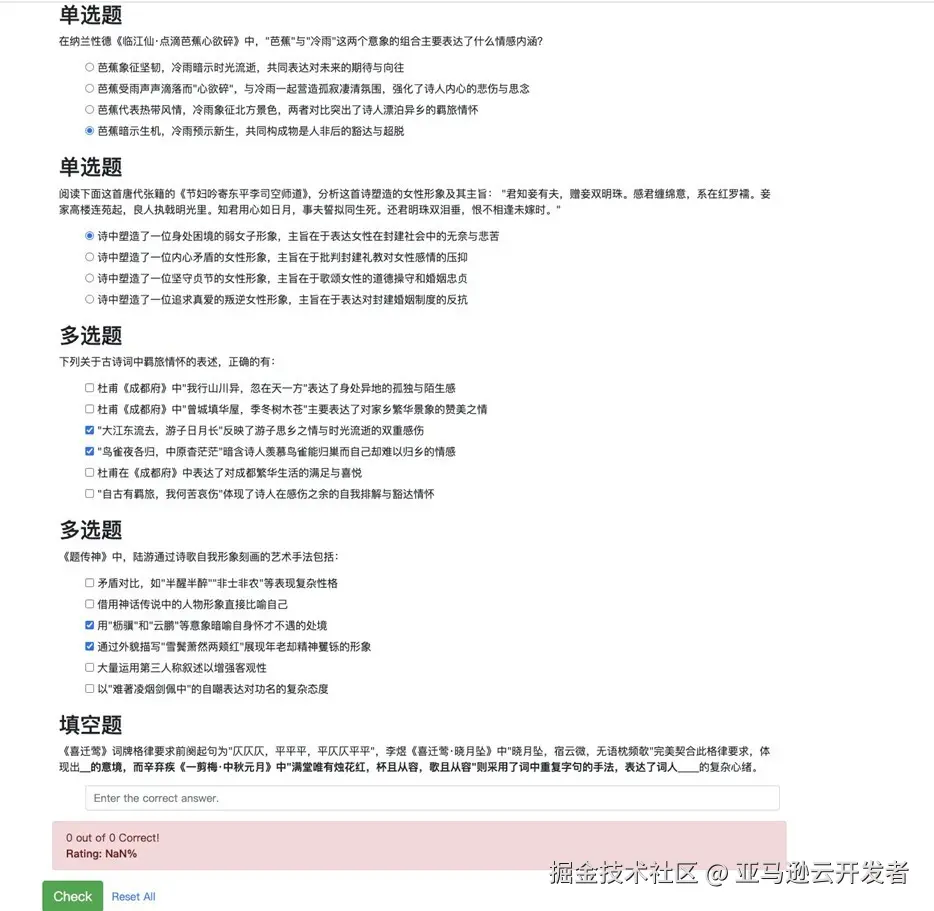 - 生成的考试内容会渲染为交互式 HTML 页面,支持选择、填空等交互操作,界面美观易用;还支持中英文双语界面,可生成不同语言的考题。