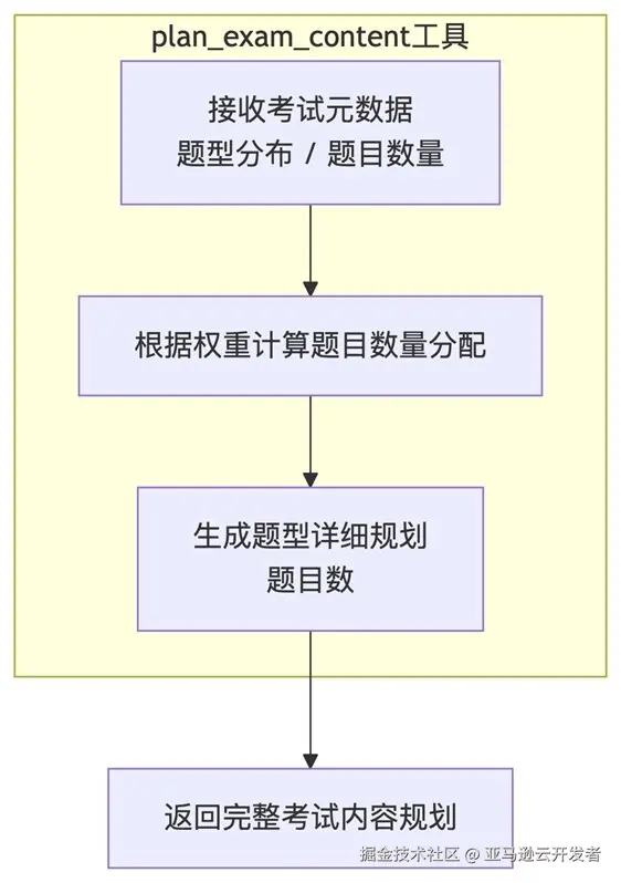 content_tools.py:负责考试内容的元数据处理与结构规划xtract_exam_metadata:从用户请求中提取年级、科目、题型等核心元数据plan_exam_content:设计考试内容框架,支持复合题型的组合逻辑validate_exam_format:校验生成内容的格式规范性exam_tools.py:专注于具体题型的生成逻辑generate_single_choice_question:接收主题、难度、参考资料等参数,生成单选题generate_multiple_choice_question:基于输入参数生成多选题generate_fill_blank_question:按指定条件生成填空题reference_tools.py:处理参考资料的解析与内容提取fetch_url_content:获取指定 URL 的网页内容,作为出题参考process_reference:从参考资料中提取关键信息,辅助考题生成render_tools.py:提供与内容渲染相关的支撑功能