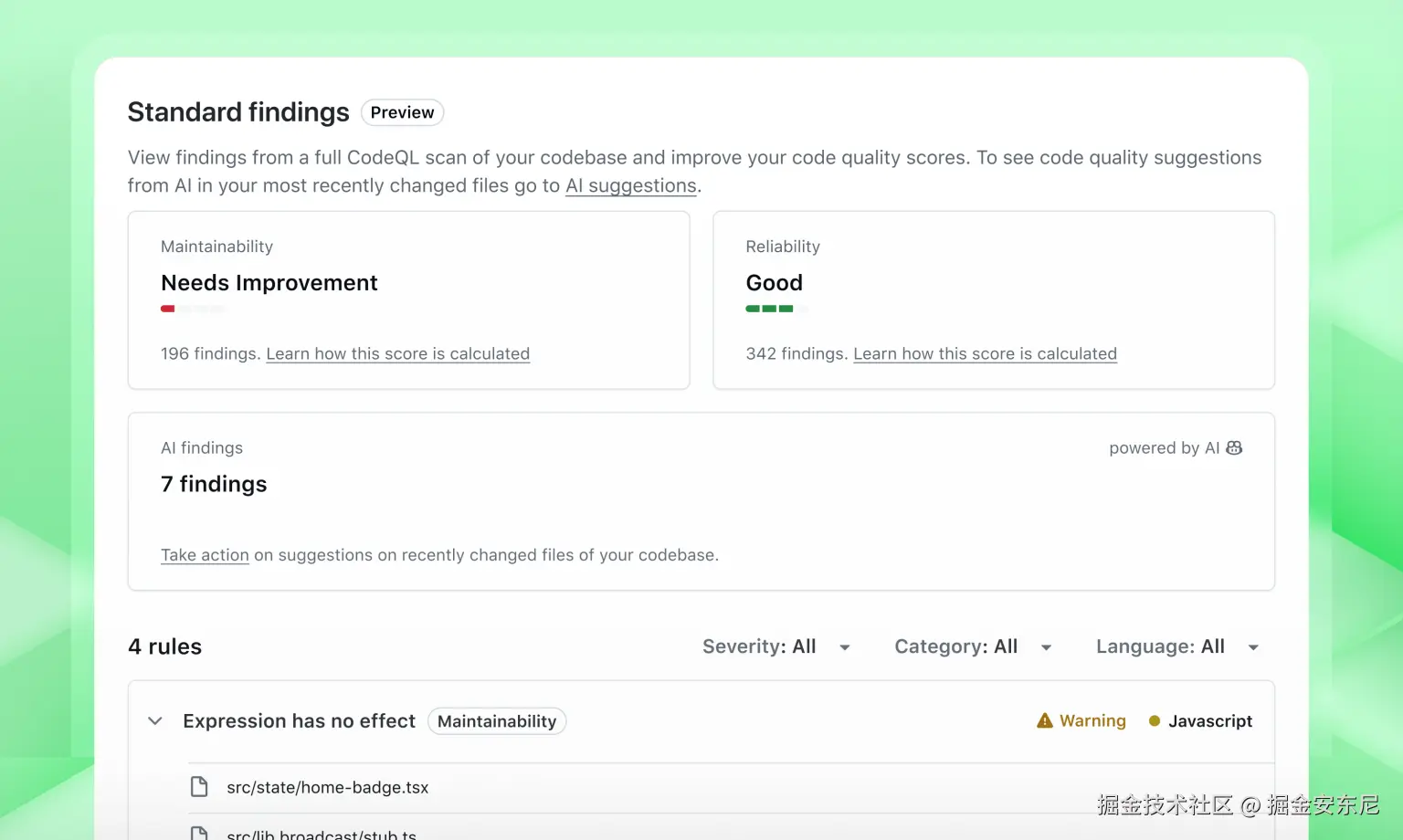 在代码质量层面,最大的问题是:“LGTM(Looks Good To Me)” 并不总代表“健康的代码”。一个看似通过的评审,可能仍在削弱代码库质量,积累长期技术债。通过 GitHub Code Quality(公测中) ,你可以在组织层面获得可见性、治理与报告能力,系统地提升代码的可维护性、可靠性与测试覆盖率。启用此功能后,Copilot 的安全检查也将扩展至代码可维护性与可靠性影响层面。