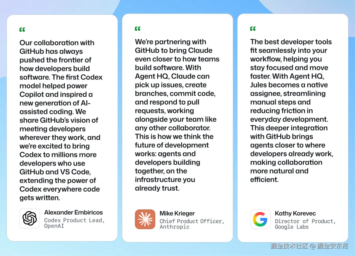 | “我们与 GitHub 的合作始终在推动软件开发的前沿。第一代 Codex 模型帮助驱动了 Copilot,也启发了新一代 AI 辅助编程。” “我们与 GitHub 有着共同的愿景——让开发者无论在哪里工作,都能直接使用 Codex。” —— Alexander Embiricos,OpenAI Codex 产品负责人“我们与 GitHub 合作,让 Claude 更贴近团队的开发方式。通过 Agent HQ,Claude 可以领取 Issue、创建分支、提交代码并响应 Pull Request,就像团队成员一样协作。” “我们相信这才是开发的未来:人类与智能体在你信任的基础设施上共同构建。” —— Mike Krieger,Anthropic 首席产品官“最好的开发工具应当无缝融入你的工作流,帮助你保持专注并加快进度。 通过 Agent HQ,Jules 变成一个原生任务接收者,减少手动步骤,让协作更自然、高效。” —— Kathy Korevec,Google Labs 产品总监 |
