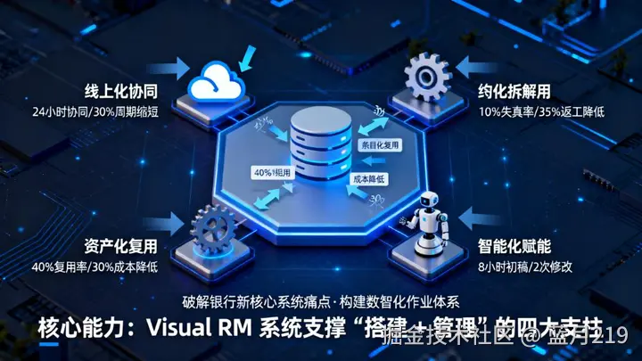 基于附件中系统功能与特性,Visual RM 需求数智化系统通过四大核心能力,精准破解银行新核心系统 “搭建 + 需求管理” 痛点,构建标准化、数智化的作业体系,具体能力如下: